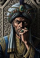 Illustratie van een strenge man met een tulband met juwelen en versierde kleding, tegen een gebeeldhouwde stenen achtergrond.