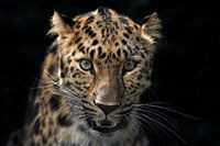 Portraet als Nahaufnahme eines Amur-Leoparden mit direktem Blickkontakt