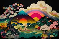 Auf dem Bild wird eine atemberaubende Darstellung einer japanischen Landschaft gezeigt. Die Farben und Muster auf dem Gemälde explodieren förmlich vor lebendiger Energie und schaffen ein fesselndes visuelles Erlebnis.