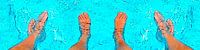 Sechs Füsse plantschen im blauen klaren Wasser mit Sonnenreflexen eines Schwimmbeckens