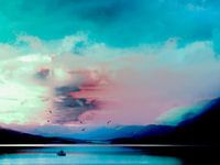 Digital bewerking waarbij een foto van een zonsondergang met een vissersbootje en een foto van een fjord gecombineerd zijn tot een nieuw kleurrijk beeld. de foto's zijn gemaakt in Noorwegen en de orginele versies zijn ook in de Bird Bee Flower and Tree shop te vinden in het album landschappen.