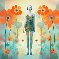 Digitale afbeelding van een een vrouw in een abstract bloemenlandschap van oranje bloemen op een aquablauwe en geel beige achtergrond. De kleuren van de jurk vermengen zich met de kleuren van de bloemen. Een afbeelding die blijft hangen en tot nadenken zet. Passend bij diverse stijlen en trends.