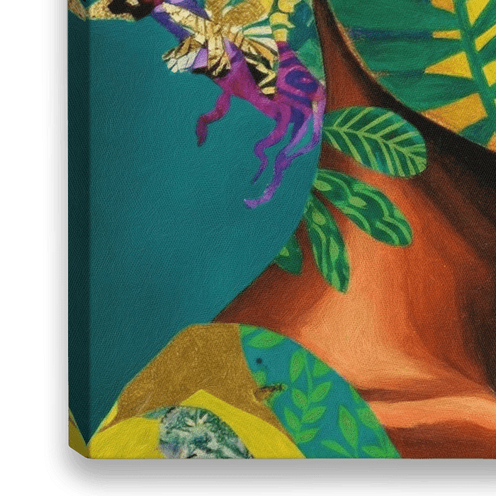 Dit levendige en kleurrijke kunstwerk is een opvallend modern portret van een Afro-Caribische vrouw. De helft van haar gezicht en haar hals zijn artistiek versierd met patronen van weelderige groene bladeren, wat een…