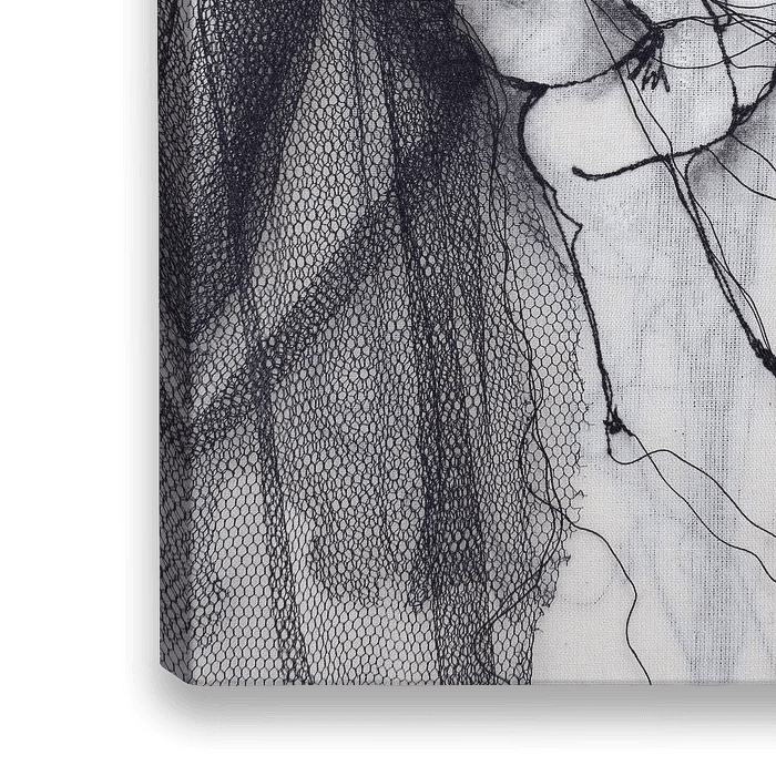 Een figuratief werk/portret van zwart draad ,tule & houtskool op doek.