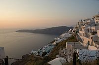 Zonsondergang in Imerovigli, op het eiland Santorini, Griekenland. Zacht warm licht versmelt de zee met de lucht en raakt de sneeuwwitte huizen van de stad.
