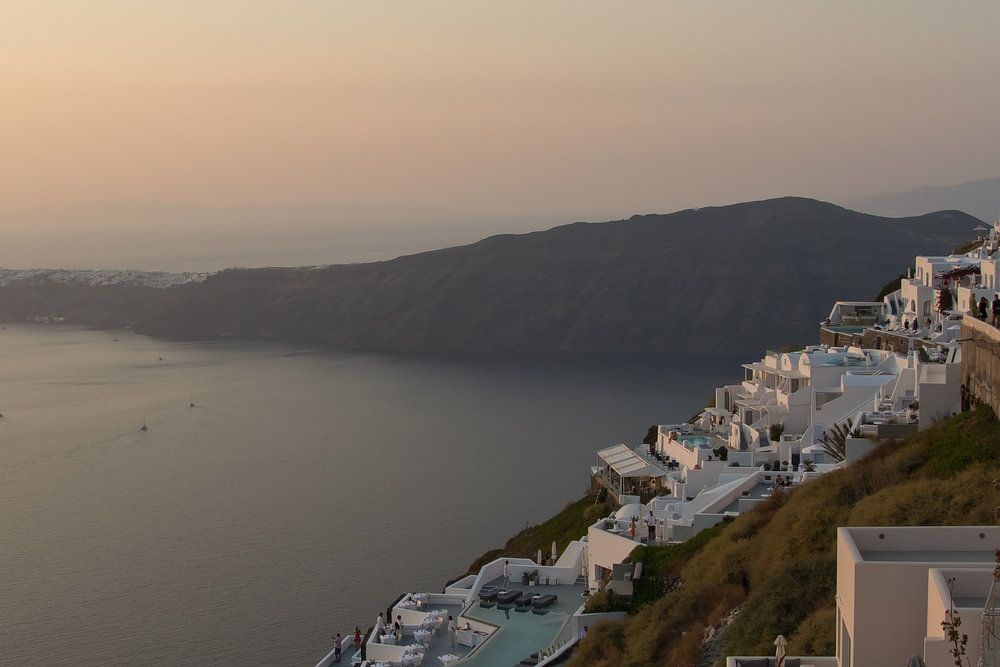 Zonsondergang in Imerovigli, op het eiland Santorini, Griekenland. Zacht warm licht versmelt de zee met de lucht en raakt de sneeuwwitte huizen van de stad.