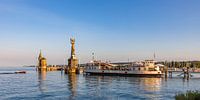 De Imperia, een standbeeld van Peter Lank, en de historische veerboot Konstanz in de haven, nu een restaurant en café, in Konstanz aan het Bodenmeer, Baden-Württemberg, Duitsland