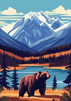 Deze afbeelding toont een imposante beer in de voorgrond, geplaatst in een prachtig berglandschap. De scène wordt gedomineerd door majestueuze, met sneeuw bedekte bergen, die een gevoel van grootsheid en kalmte uitstralen. De beer lijkt rustig te observeren, te midden van een serene natuursetting met een meer en naaldbomen, wat een…