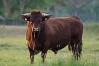 Imposante stier toont zich als de baas. Hier ben ik de baas lijkt hij te zeggen. Je ziet een brok spieren en hij straalt kracht uit en heeft een machtige kop. Zijn uitstraling is van onverzettelijkheid. Kom niet bij mij in de wei.
