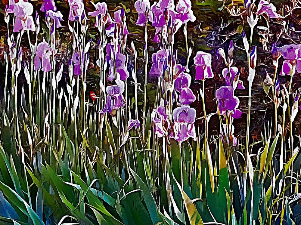Fotokunst geïnspireerd door de zonsondergang op een deel van mijn tuin. Het roze licht van de zonsondergang kleurt blauwe irissen paars en lila in deze Italiaanse tuin. Prachtig overdag, met hun hoge bloemen die het landschap opfleuren, worden deze bloemen door het zonlicht getransformeerd in kleurenpracht die afsteekt tegen de rest van het groene gebladerte in de tuin.