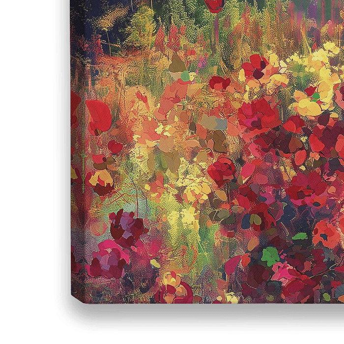 Levendig bloemenveld in een impressionistische stijl. Een overvloed aan kleurrijke bloemen strekt zich uit over het doek, waarbij de penseelstreken de levendigheid en beweging van de natuur vastleggen. De kleuren lijken te dansen en te vibreren op het canvas, waardoor een gevoel van vreugde en vitaliteit ontstaat.