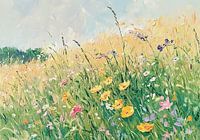 Een weide met wilde bloemen, zachte pastelkleuren, een olieverfschilderij in impressionistische stijl, met zichtbare penseelstreken, veel detail, scherpe focus, een mooie compositie, zeer gedetailleerd, helder, natuurlijke belichting, een landschap op een zonnige dag, grazige weiden, in de zomer, en een heldere lucht met zonneschijn.