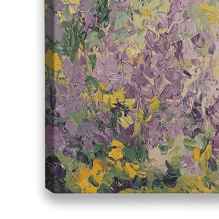Een rivier met groene bomen en paarse bloemen, een olieverfschilderij in de stijl van Claude Monet, een stenen boogbrug over het water ervoor, impressionistische stijl, gele lucht, zonnige dag, stadsgezicht in de verte, rustig tafereel, zachte penseelstreken, lichte pastelkleuren, rustige sfeer, natuurlijke belichting, weerspiegelingen op het wateroppervlak, vredige sfeer.