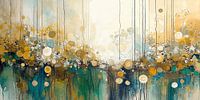 Dit abstracte schilderij vangt een betoverend natuurtafereel. Verticale lijnen suggereren bomen of regen, terwijl cirkels in goud, groen en blauw een magische sfeer creëren. De gouden gloed bovenaan contrasteert met diepere tinten onderaan, wat een zonsopgang in een bos evoceert. Cirkelvormige elementen doen denken aan regendruppels of lichtreflecties, wat het werk dynamiek geeft. De compositie balanceert tussen abstractie en landschap, en nodigt uit tot contemplatie in een ruimte waar natuur en verbeelding samensmelten. Het werk roept verwondering en sereniteit op in een dromerige interpretatie van de natuur.
