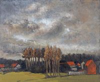 Impressionistische weergave van een Vlaams landschap met huizen, boerderijen en een dreigende wolkenlucht - olieverf op houten paneel - Pieter Ringoot.