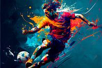 De levendige kleuren en expressieve lijnen leggen prachtig de snelheid en energie van de voetballer vast.