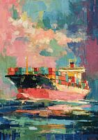 Dit impressionistische schilderij toont een groot vrachtschip dat over kalm water glijdt. Vette penseelstreken in rood, zwart en wit vormen de romp, terwijl kleurrijke containers in rood, blauw, groen en geel op het dek zijn gestapeld. Het wateroppervlak weerspiegelt de kleuren van het schip en de zacht gloeiende lucht, die is…
