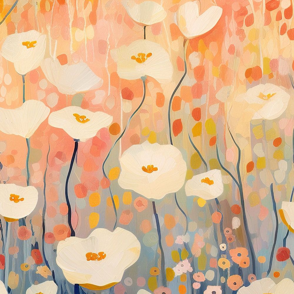 Impressionistische Bloemen - Dit schilderij, doordrenkt met tonen van licht zalmroze Peach Fuzz, toont een veld van bloeiende bloemen in een impressionistische stijl. Het bovenste gedeelte baadt in warme kleuren die geleidelijk overgaan in koelere tinten blauw en turkoois die de stengels en achtergrond vormgeven. Het gebruik van kleurrijke stippen geeft een levendige, maar rustgevende textuur aan het geheel.