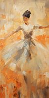 Impressionistische Danseres Oranje - Dit schilderij vangt een sierlijke danseres in een breed uitstaande rok, uitgebeeld in een impressionistische stijl met dynamische penseelstreken. De overheersende warme tinten van oranje en beige dragen bij aan een gevoel van beweging en lichtheid, terwijl de subtiele grijze en witte accenten diepte en textuur toevoegen.