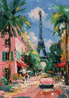 Dit impressionistische schilderij toont de Eiffeltoren in Parijs in een levendig straatbeeld. Pastelkleurige gebouwen in roze, levendige groene palmbomen en een lucht in blauw, geel en oranje smelten samen tot een stralende compositie. Met zichtbare penseelstreken en een intense verscheidenheid aan kleuren doet het werk denken aan de olieverfschilderijen van de grote impressionisten. Parijs wordt hier niet afgebeeld als een klassieke skyline, maar als een kleurrijke, pulserende ervaring vol beweging. Een artistiek hoogtepunt voor liefhebbers van moderne impressionistische kunst en de stad van de liefde.