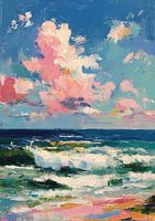 Een levendig olieverfschilderij toont de zee met hoge golven onder een lucht vol kleurrijke wolken. Levendige kleuren van roze, blauw, groen en wit creëren een impressionistisch effect en vangen licht, beweging en stemming. Een zandstrand strekt zich uit op de voorgrond, geschilderd met zachte penseelstreken en zichtbare kleurlagen die…