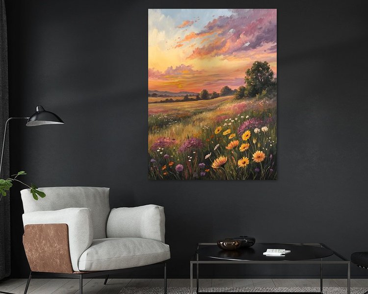 Een levendig impressionistisch schilderij van een veld wilde bloemen bij zonsondergang. De lucht is gevuld met warme oranje, roze en paarse tinten die prachtig contrasteren met de koele tinten van de heuvels in de verte. De voorgrond is gevuld met een rijk tapijt van kleurrijke bloemen, weergegeven met losse, expressieve penseelstreken die kenmerkend zijn voor de impressionistische stijl.