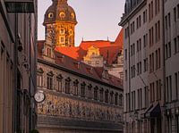in Dresden in de vroege ochtend. De eerste zonnestralen zochten hun weg door de Augustusstrasse langs de Fürstenzug.