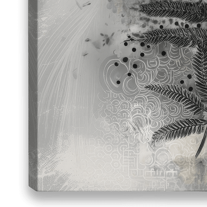 abstract schilderij met geometrie en natuur, digitaal botanisch kunstwerk in neutrale kleuren, rustgevende muurdecoratie voor minimalistisch interieur, kunst met bladeren en cirkels voor Scandinavisch interieur, digitaal schilderij voor Japandi woonkamer of werkplek, mixed media schilderij met natuurmotieven, visuele ademruimte voor drukke ruimtes, moderne wandkunst in grijs, beige en blauw, kalmerende decoratie voor slaapkamer of thuiswerkplek, kunst met natuurlijke elementen en geometrische vormen
