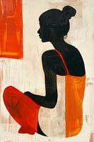 De krachtige silhouetlijnen zijn uitgevoerd in diep zwart, wat een scherp contrast vormt met de warme oranje en rode tinten van haar kleding en de achtergrond. De houding van de vrouw, met opgetrokken knieën en een rechte rug, straalt…