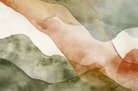 Deze abstracte schildering toont een gelaagde compositie van organische vormen die doen denken aan heuvels, golven of aardlagen. De kleuren zijn warm en natuurlijk: zachte groentinten, beige en roodbruin vloeien in elkaar over zonder harde lijnen. De vormen overlappen elkaar subtiel, waardoor er diepte ontstaat en het geheel een rustige, harmonieuze uitstraling krijgt.