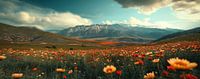 Dit kunstwerk toont een uitgestrekt veld vol met kleurrijke bloemen, voornamelijk gele en rode chrysanten, die zich sierlijk uitstrekken richting de bergen aan de horizon.