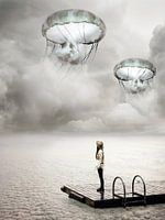 Surrealistisch digitaal schilderij in sepia, bruin en zacht groene tinten met een vrouw op een steiger in de wolken en in de lucht twee grote lichtgevende kwallen. Fantasie kunst, vreemde dromen:)