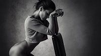 Deze zwart-witfotografie vangt een moment van verstilling dat tegelijkertijd intiem en krachtig aanvoelt. De jonge vrouw is zijdelings in beeld gebracht, haar bovenlichaam licht naar voren gebogen terwijl ze haar armen rust op de rugleuning van een stoel. Haar ogen zijn gesloten, het hoofd zachtjes tegen haar handen geleund, waardoor…