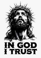 Vette, monochrome illustratie van Christus met een doornenkroon boven de tekst "IN GOD I TRUST", die een sterk geloof en toewijding uitdrukt.