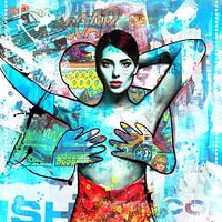 Uit een grotere serie 'Model Meets Comic' waarin ik telkens een mashup maak van twee werelden: fashion & vintage comics. Samen vertellen ze spannend nieuw verhaal.De originele werken zijn mixed media opgebouwd elementen uit stripboeken, tijdschriften & acrylverf.