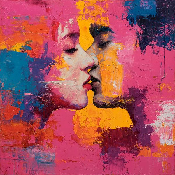Een abstract schilderij met twee gezichten in profiel, die elkaar zachtjes met hun voorhoofden aanraken en op het punt staan ​​te kussen. De gezichten zijn gestileerd weergegeven met zachte vloeiende lijnen en krachtige penseelstreken. De algehele compositie benadrukt een gevoel van passie en tederheid.
