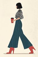 Een stijlvolle illustratie van een moderne vrouw in beweging, gekenmerkt door een minimalistische maar krachtige uitstraling. De figuur draagt een gestreept shirt, een wijde broek en rode hakken, terwijl ze een coffee-to-go beker vasthoudt. De combinatie van de strakke lijnen, het beperkte kleurenpalet van rood, blauw en zwart-wit, en…