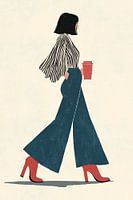 Een stijlvolle minimalistische illustratie van een moderne vrouw in beweging, gekleed in een gestreepte blouse en wijde broek in diepblauw. De rode accenten in haar koffiebekertje en hakken geven het geheel een krachtige dynamiek. De eenvoudige lijnen en het beperkte kleurenpalet creëren een tijdloos gevoel met een duidelijke hedendaagse uitstraling.