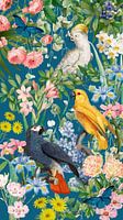 Vogels en vlinders in een landschap vol bloemen en planten.