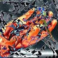 In The Hand Of The Gods abstract digitale gouache schilderij van een naakte vrouw die op een hand ligt