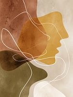 Warme herfsttinten met gestileerde menselijke silhouetten en vloeiende lijnen. In de compositie zijn meerdere profielen te herkennen die in elkaar overvloeien, gevormd door kleurvlakken in okergeel, roestbruin, olijfgroen en beige. Deze aardse kleuren zijn niet alleen visueel aantrekkelijk, maar roepen ook de sfeer op van het herfstseizoen: rijping, verandering en introspectie.