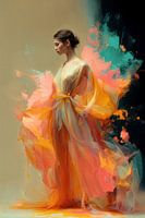 Een digitaal kunstwerk waarin een elegant silhouet gehuld is in een spectaculaire jurk die lijkt te transformeren in vloeiende kleuren. De compositie komt tot leven door een dramatisch samenspel van warme oranje en koraal tinten die contrasteren met diep turquoise, waarbij de stof lijkt te versmelten met abstracte, dynamische penseelstreken die de overgang tussen figuur en achtergrond vervagen.