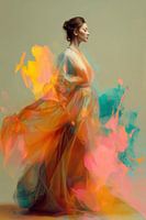 Een digitaal kunstwerk waarin een gracieuze gestalte in een zwevende jurk centraal staat. De compositie wordt gedomineerd door een dynamisch samenspel van warme oranje en gele tinten die contrasteren met koele turquoise accenten. De ethereal kwaliteit van de doorschijnende stof creëert een dromerige atmosfeer, terwijl de vloeiende…