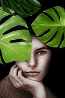 Portret van een jonge vrouw met sproetjes, verscholen achter groene bladeren.