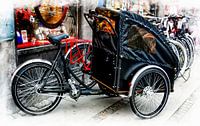 Buiten een fietsenwinkel in Kopenhagen, Denemarken, vond ik deze prachtige gloednieuwe fietskinderwagen. Een driewieler, de fietstas aan de voorkant heeft een afneembare kap met doorzichtige ruimtes zodat de kleine aan boord naar de buitenwereld kan kijken. Fotokunst met filter toegevoegd.