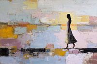 In dit schilderij staat een vrouw centraal die langs een donkere lijn lijkt te lopen, alsof ze balanceert tussen twee werelden. Haar houding is krachtig maar ingetogen, en haar silhouet steekt af tegen een achtergrond van zachte, gelaagde kleuren. Denk aan crème, lichtgeel, poederroze en een vleugje blauw, afgewisseld met donkere…