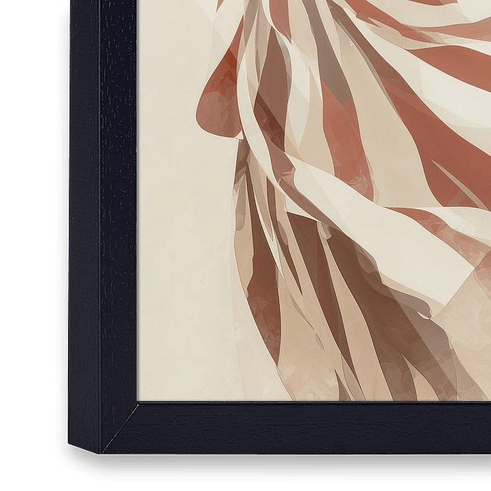 Een minimalistisch kunstwerk in warme terracotta tinten toont een sierlijke silhouet, gehuld in een wapperende jurk of gewaad. De beweging van de stof is op een abstracte wijze vastgelegd, waarbij de lijnen en vlakken een dynamisch spel vormen tussen licht en schaduw. De compositie straalt zowel kracht als elegantie uit, met een…