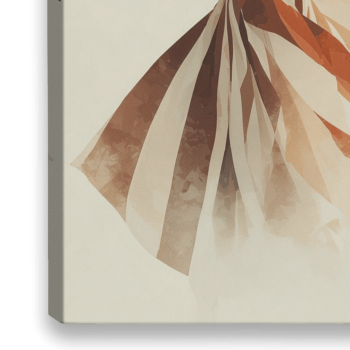 Een etherische illustratie in warme sepiatinten toont een sierlijke silhouet in een wapperende jurk die lijkt te dansen met de wind. De zachte, vloeiende lijnen en subtiele kleurovergangen creëren een tijdloze elegantie, waarbij de stof zich vermengt met de lichte achtergrond in een perfecte harmonie van beweging en rust.