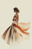 Een etherische illustratie in warme sepiatinten toont een sierlijke silhouet in een wapperende jurk die lijkt te dansen met de wind. De zachte, vloeiende lijnen en subtiele kleurovergangen creëren een tijdloze elegantie, waarbij de stof zich vermengt met de lichte achtergrond in een perfecte harmonie van beweging en rust.