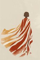 Een minimalistisch maar krachtig kunstwerk waarin een sierlijk silhouet gehuld is in een wapperende mantel van warme terracotta en zandkleurige strepen. De compositie straalt een bijzondere elegantie uit door de vloeiende beweging van de stof, die lijkt te dansen in een onzichtbare wind tegen een lichte achtergrond.